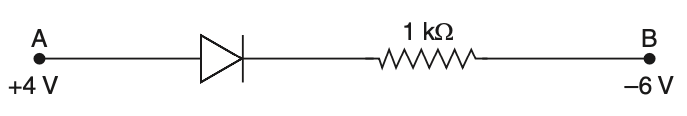 To solve this problem, we need to analyze the circuit with the ideal diode.Given:• Voltage at point A is V.• Voltage at point B is V.• Resistor value is kStep 1: Determine the direction of current flow.• The diode allows current to flow from higher to lower potential.• Voltage at A is higher than at B, so the diode is forward-biased.Step 2: Calculate the voltage across the resistor.• Voltage across AB is VV.Step 3: Use Ohm's Law to find the current.ATherefore, the current flowing through AB is A which is A.This corresponds to Option 4.