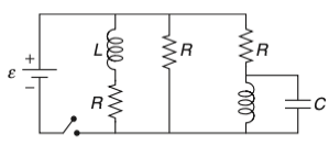 Figure shows a circuit that contains three identical resistors with resistance each, two identical inductors with inductance mH each, and an ideal battery with emf The current through the battery just after the switch is closed is