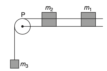 A system consists of three masses and connected by a string passing over a pulley P. The mass hangs freely and and are on a rough horizontal table (the coefficient of friction The pulley is frictionless and of negligible mass. The downward acceleration of mass is (Assume )