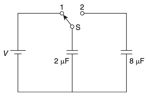 To solve this problem, we need to calculate the energy dissipated when the switch is moved from position 1 to position 2.Initially, the 2 μF capacitor is charged to a voltage The initial energy stored in the 2 μF capacitor is given by:When the switch is moved to position 2, the 2 μF capacitor is connected in parallel with the 8 μF capacitor.The total capacitance is:The charge on the 2 μF capacitor is:This charge is now distributed over the total capacitance, so the new voltage is:The final energy stored in the system is:The energy dissipated is:The percentage of energy dissipated is:PercentagePercentagePercentageTherefore, the percentage of stored energy dissipated is , which corresponds to Option 2.