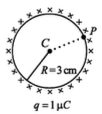 A thin spherical shell is charged by some source. The potential difference between the two points C and P (in V) shown in the figure is: SI units