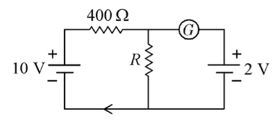 To solve this problem, we will use the concept of a balanced Wheatstone bridge.Given:⢠A 10 V battery in series with a 400 resistor.⢠A 2 V battery in parallel with resistor ⢠Galvanometer G shows no deflection, indicating no current through it.
