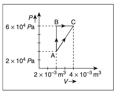 The figure below shows two paths that may be taken by a gas to go from a state A to a state C. In process AB, J of heat is added to the system and in process BC, J of heat is added to the system. The heat absorbed by the system in the process AC will be