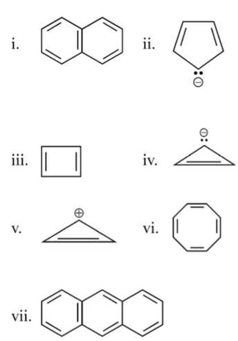 To determine which compounds obey Huckel's rule, we need to check if they are aromatic.A compound is aromatic if it is cyclic, planar, fully conjugated, and has electrons, where is a non-negative integer.Let's analyze each compound:• Compound (i): Naphthalene - It is cyclic, planar, and fully conjugated. - It has 10 electrons. - - Obeys Huckel's rule.• Compound (ii): Cyclopentadienyl anion - It is cyclic, planar, and fully conjugated. - It has 6 electrons (4 from double bonds + 2 from the anion). - - Obeys Huckel's rule.• Compound (iii): Cyclobutadiene - It is cyclic and planar, but not aromatic. - It has 4 electrons. - - Does not obey Huckel's rule.• Compound (iv): Cyclopropenyl cation - It is cyclic, planar, and fully conjugated. - It has 2 electrons. - - Obeys Huckel's rule.• Compound (v): Cyclopropenyl anion - It is cyclic and planar, but not aromatic. - It has 4 electrons. - - Does not obey Huckel's rule.• Compound (vi): Cyclooctatetraene - It is cyclic and has 8 electrons, but it is non-planar. - Does not obey Huckel's rule.• Compound (vii): Anthracene - It is cyclic, planar, and fully conjugated. - It has 14 electrons. - - Obeys Huckel's rule.Therefore, the compounds that obey Huckel's rule are:(i), (ii), (iv), and (vii).The number of compounds that obey Huckel's rule is 4.This corresponds to Option 1.
