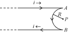 To solve this problem, we need to find the magnetic field at point P due to the current in the wire.The wire consists of three parts: two straight sections and one semi-circular section.1. Magnetic field due to the straight sections:• The magnetic field at the center of a straight wire is zero because the contributions from opposite sides cancel each other out.2. Magnetic field due to the semi-circular section: