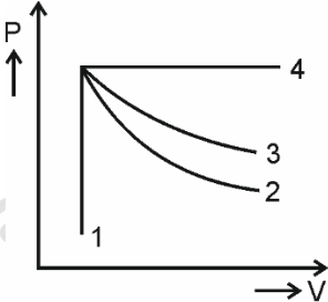 To solve this problem, we need to identify the curve that represents the adiabatic process.In a PV diagram:• An adiabatic process is steeper than an isothermal process.• An isothermal process follows constant.• An adiabatic process follows constant, where Analyzing the given curves:• Curve 1 is vertical, indicating an isochoric process (constant volume).• Curve 4 is horizontal, indicating an isobaric process (constant pressure).• Curves 2 and 3 are downward sloping, indicating either isothermal or adiabatic processes.Since the adiabatic process is steeper than the isothermal process,curve 2 is steeper than curve 3.Therefore, curve 2 represents the adiabatic process.The correct option is 2.