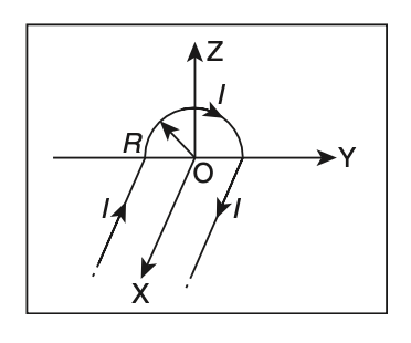A wire carrying current has the shape as shown in the adjoining figure. Linear parts of the wire are very long and parallel to the x-axis while a semi-circular portion of radius is lying in a plane. Magnetic field at point is