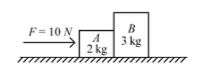 A horizontal force 10N is applied to a block A as shown in figure. The mass of blocks A and B are 2 kg and 3 kg, respectively. The blocks slide over a frictionless surface. The force exerted by block A on block B is: