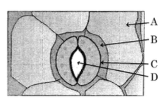 To solve this problem, we need to identify the component in the given figure that has thin outer walls and highly thickened inner walls.Let's analyze the image:The figure shows a cross-section of a stoma with labeled parts A, B, C, and D.In a typical stoma, the guard cells are the components that control the opening and closing of the stomatal pore.Guard cells have a unique structure with thin outer walls and highly thickened inner walls.Now, let's match this description with the labeled parts:Part C is the guard cell, which matches the description of having thin outer walls and thickened inner walls.Therefore, the correct answer is Option 3: C.