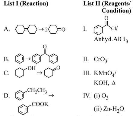 To solve this problem, we need to match the reactions in List I with the appropriate reagents/conditions in List II.Let's analyze each reaction:A. The reaction is the cleavage of an alkene to form two carbonyl compounds. This is characteristic of ozonolysis.Therefore, A matches with IV: OZn-HOB. The reaction is Friedel-Crafts acylation, where a benzene ring is acylated.Therefore, B matches with I: Anhydrous AlCland an acyl chloride.C. The reaction involves the oxidation of a secondary alcohol to a ketone.Therefore, C matches with II: CrOD. The reaction is the oxidation of a side chain to form a carboxylic acid.Therefore, D matches with III: KMnOKOHBased on the analysis, the correct matching is:AIVBICIIDIIIThis corresponds to Option 1.