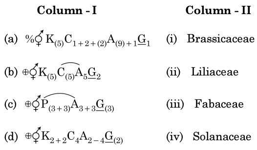 To solve this problem, we need to match the floral formulas in Column-I with the correct families in Column-II.Let's analyze each option:(a) • This floral formula represents the family Fabaceae.• Characteristics: Papilionaceous corolla, diadelphous stamens, monocarpellary ovary.(b) • This floral formula represents the family Solanaceae.• Characteristics: Actinomorphic, pentamerous, bicarpellary ovary.(c) • This floral formula represents the family Liliaceae.• Characteristics: Trimerous flowers, superior ovary, monocot family.(d) • This floral formula represents the family Brassicaceae.• Characteristics: Tetradynamous stamens, bicarpellary ovary, cruciform corolla.Matching the columns:(a) matches with (iii) Fabaceae(b) matches with (iv) Solanaceae(c) matches with (ii) Liliaceae(d) matches with (i) BrassicaceaeTherefore, the correct option is Option 1:(a)->(iii), (b)->(iv), (c)->(ii), (d)->(i)