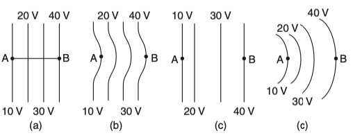 The diagrams below show regions of equipotential. A positive charge is moved from A to B in each diagram.