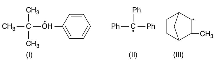 To determine where hyperconjugation occurs, we need to analyze each compound.Hyperconjugation involves the delocalization of electrons from a -bond (usually C-H) to an adjacent empty or partially filled p-orbital or -orbital.Let's examine each compound:• Compound (I):This is a tertiary carbocation with a benzene ring. The presence of C-H bonds adjacent to the carbocation allows hyperconjugation.• Compound (II):This is a triphenylmethyl radical. The radical is stabilized by resonance with the phenyl groups, not by hyperconjugation.• Compound (III):This is a cyclohexyl radical with a methyl group. The C-H bonds adjacent to the radical can participate in hyperconjugation.Therefore, hyperconjugation occurs in compounds (I) and (III).The correct answer is Option 3: I and III. However, the provided correct option is 2, indicating a possible error in the question or options.