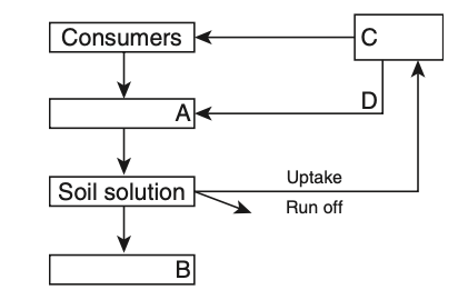 To solve this problem, we need to identify the blanks in the phosphorus cycling model. Let's analyze each component:A: This represents the flow from soil solution to plants. In the phosphorus cycle, plants uptake phosphorus from the soil. Therefore, A is Producers.B: This represents the flow from soil solution to another component. In the phosphorus cycle, phosphorus can be lost from the soil through runoff. Therefore, B is Rock minerals.C: This represents the flow from consumers back to the soil. In the phosphorus cycle, this is typically through waste and decay. Therefore, C is Detritus.D: This represents the flow from plants back to the soil. In the phosphorus cycle, this occurs through litter fall. Therefore, D is Litter fall.Now, let's match the blanks with the correct terms:Producers, B \rightarrow Rock minerals, C \rightarrow Detritus, D \rightarrow Litter fallThis corresponds to Option 3.