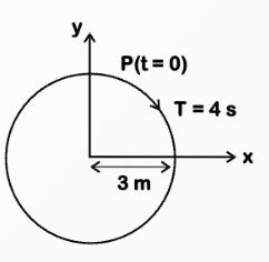 The radius of circle, the period of revolution, initial position and sense of revolution are indicated in the figure. The y-projection of the radius vector of rotating particle P is: