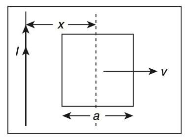 A conducting square frame of side and a long straight wire carrying current are located in the same plane as shown in the figure. The frame moves to the right with a constant velocity The emf induced in the frame will be proportional to