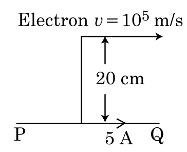 An infinitely long straight conductor carries a current of 5 A as shown. An electron is moving with a speed of m/s parallel to the conductor. The perpendicular distance between the electron and the conductor is cm at an instant. Calculate the magnitude of the force experienced by the electron at that instant.