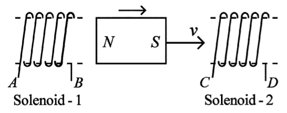 To solve this problem, we will use Lenz's Law and Faraday's Law of electromagnetic induction.Lenz's Law states that the direction of the induced current is such that it opposes the change in magnetic flux.Given: A strong bar magnet is moving towards solenoid-2 from solenoid-1.Let's analyze the situation:1. As the magnet moves towards solenoid-1, the magnetic flux through solenoid-1 increases. According to Lenz's Law, the induced current in solenoid-1 will oppose this increase. This means solenoid-1 will act to repel the approaching north pole of the magnet. Therefore, the induced current in solenoid-1 will flow from A to B.2. As the magnet moves towards solenoid-2, the magnetic flux through solenoid-2 increases. According to Lenz's Law, the induced current in solenoid-2 will oppose this increase. This means solenoid-2 will act to repel the approaching south pole of the magnet. Therefore, the induced current in solenoid-2 will flow from D to C.Thus, the direction of induced current is:• In solenoid-1: AB• In solenoid-2: DCTherefore, the correct option is Option 3: AB and DC.